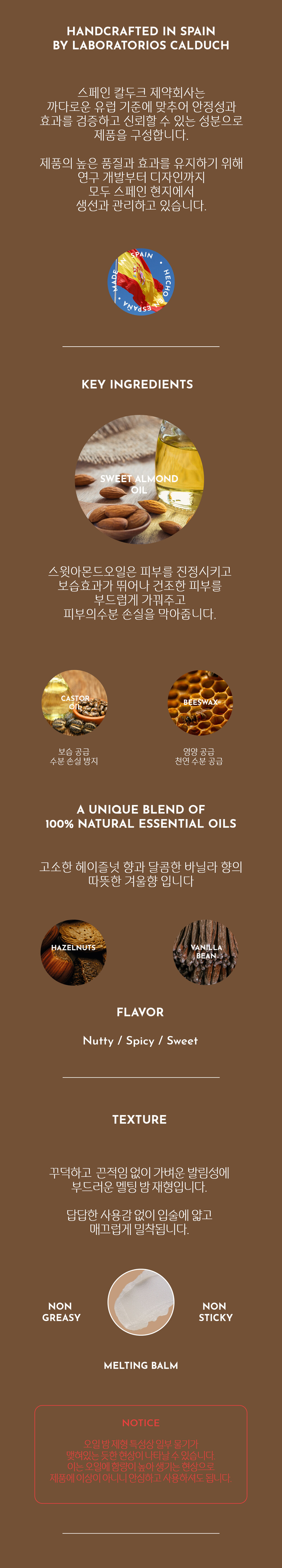 주요성분 : 피마자씨오일, 호호바씨오일, 해바라기씨오일, 옻나무껍질왁스, 세라알바, 칸데릴라왁스, 해바라기씨왁스, 사라수나무수지, 향료, 스위트아몬드오일(0.5%), 아스코빌팔미테이트, 토코페롤, 카나우바왁스