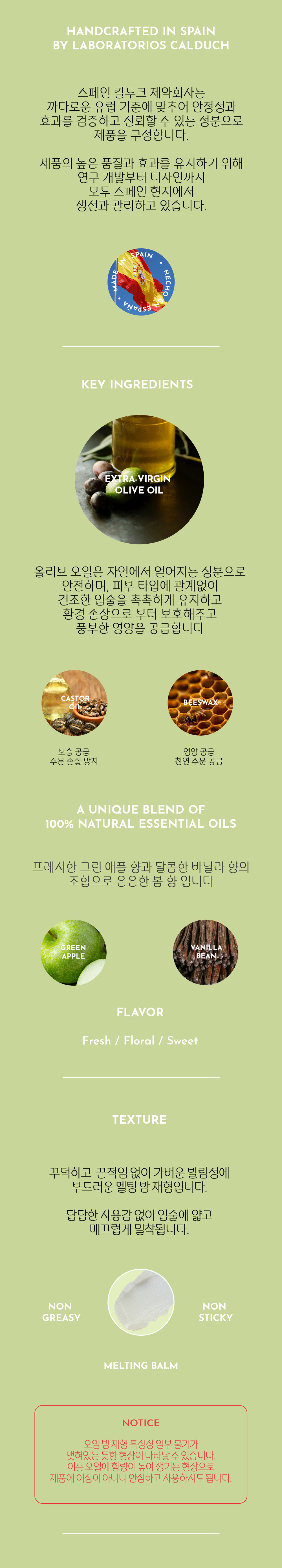 주요성분 : 피마자씨오일, 옻나무껍질왁스, 호호바씨오일, 미리스틸알코올, 세테아릴알코올, 세라알바, 카프릴릭/카프릭트라이글리세라이드, 향료, 해바라기씨오일, 올리브오일(0.5%), 카나우바왁스, 토코페롤, 칸데릴라왁스, 해바라기씨왁스, 아스코빌팔미테이트, 사라수나무수지